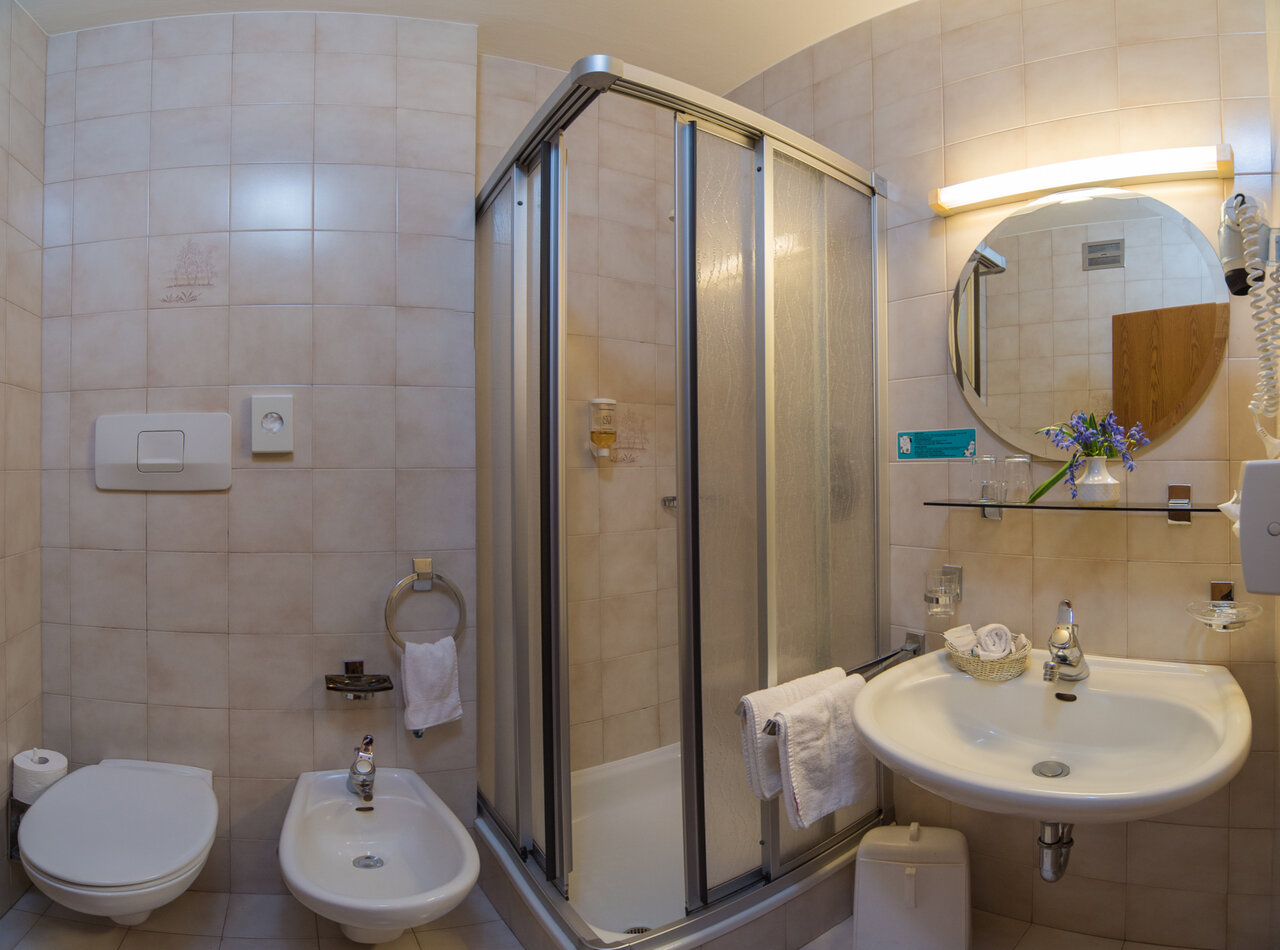 - Bathroom with toilet/bidet, hairdryer, make-up mirror, Pure Herbs cosmetics 100% recyclable packaged.